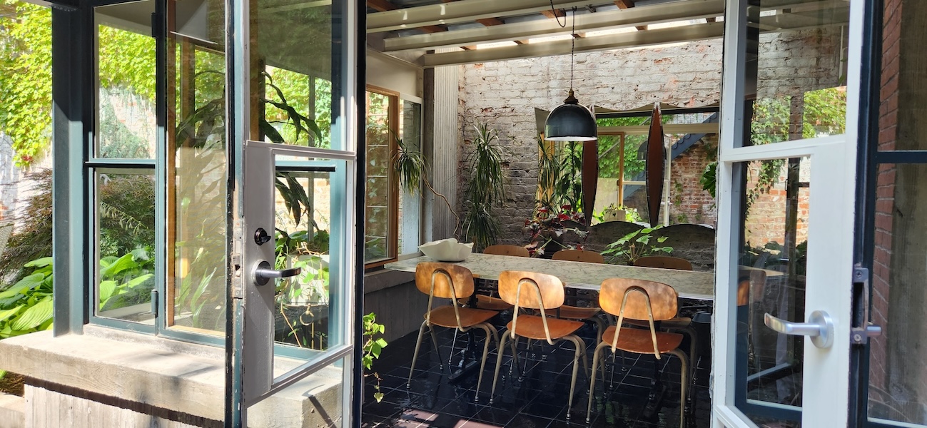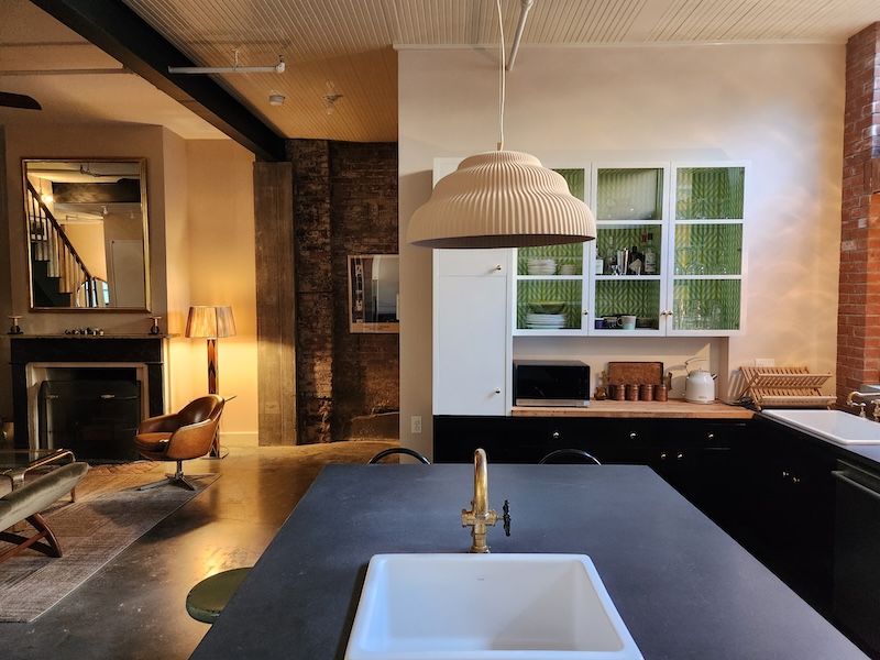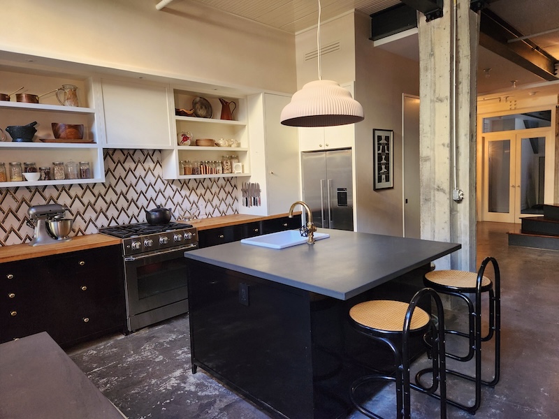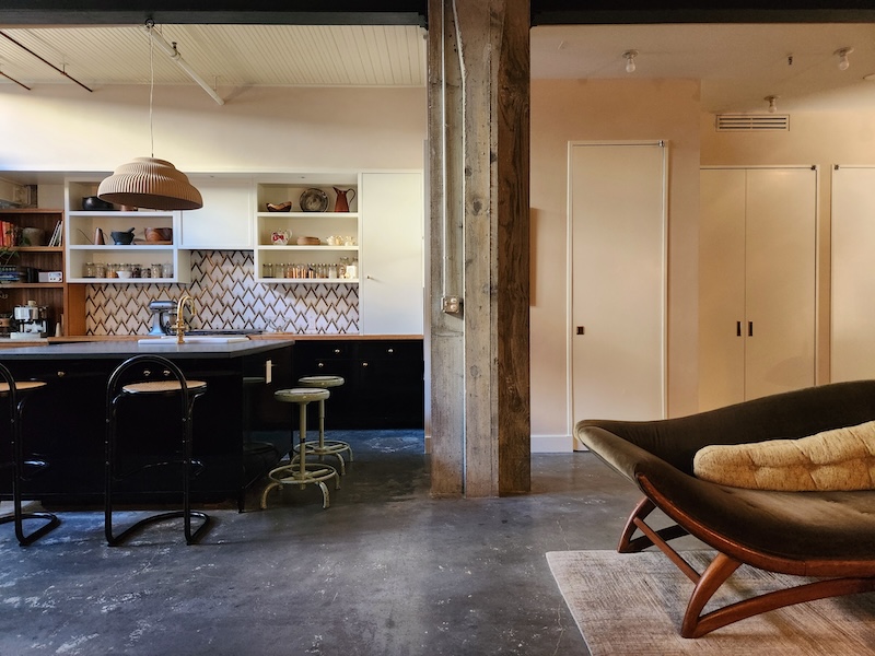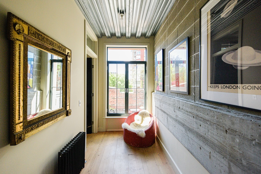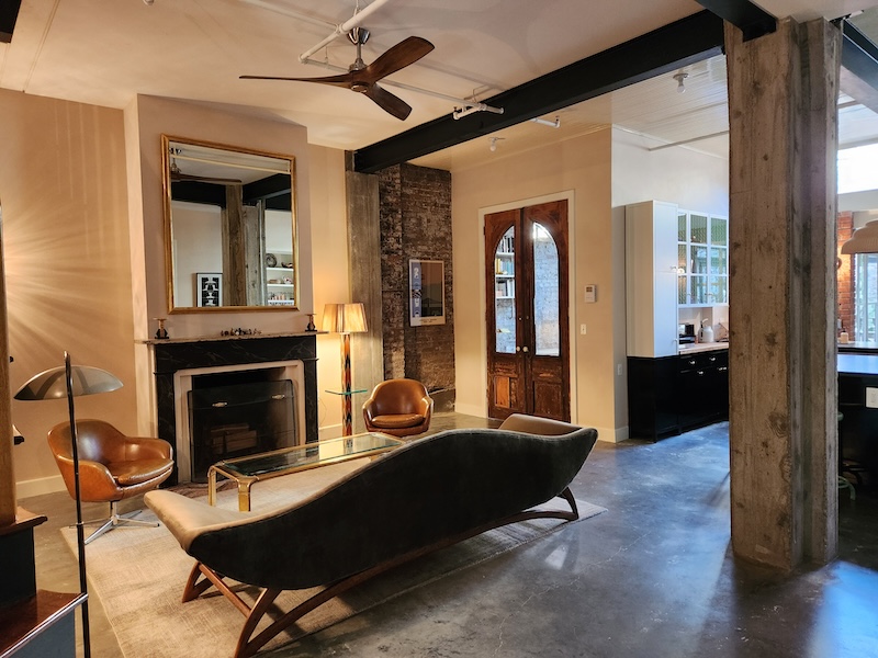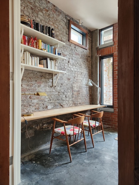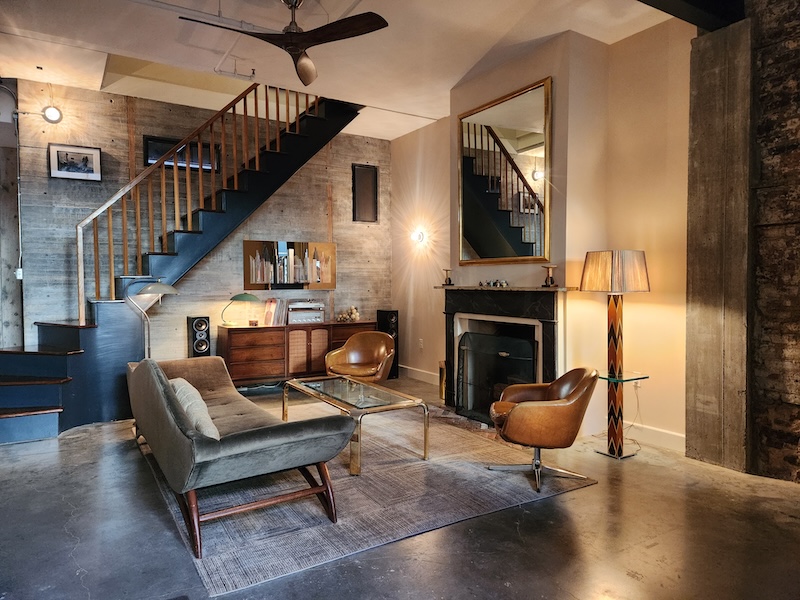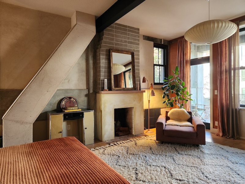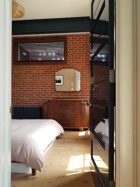 Originally a one-story auto-repair shop, now converted to apartment. This 2350 sq ft apartment has 11′ ceilings, exposed brick, poured concrete surfaces and steel windows throughout. Completed in 2015, the building mixes industry standard materials with architectural salvage finds and, with its variety of high-end interior finishes, this space has a uniquely textured, designer loft-like feel.