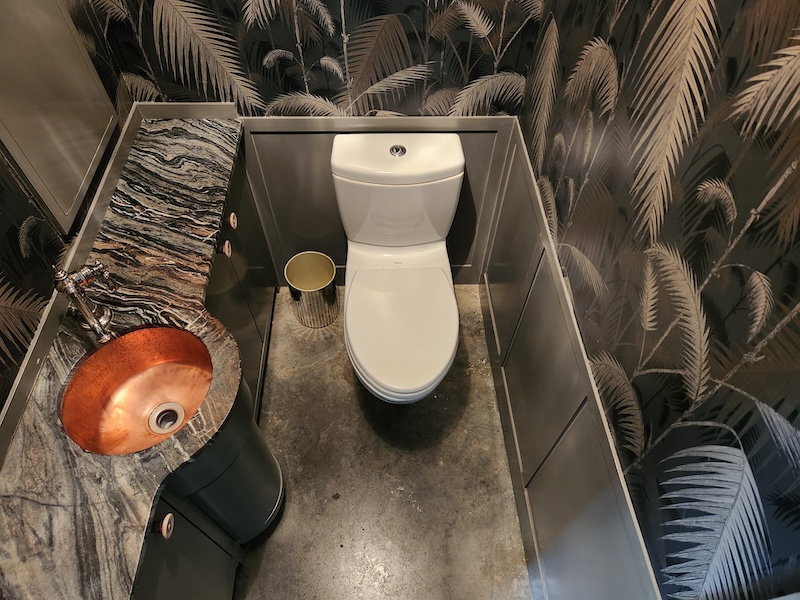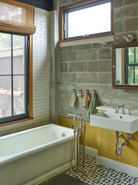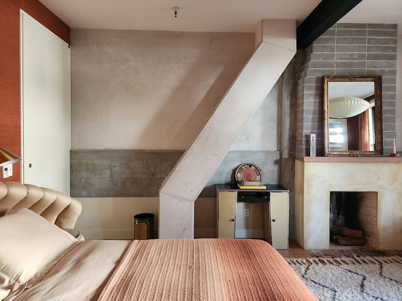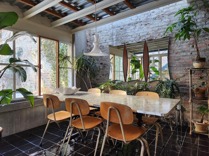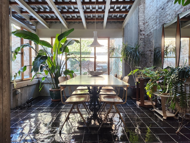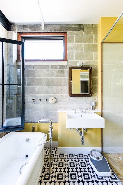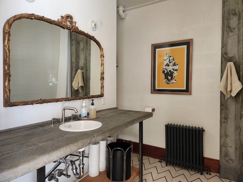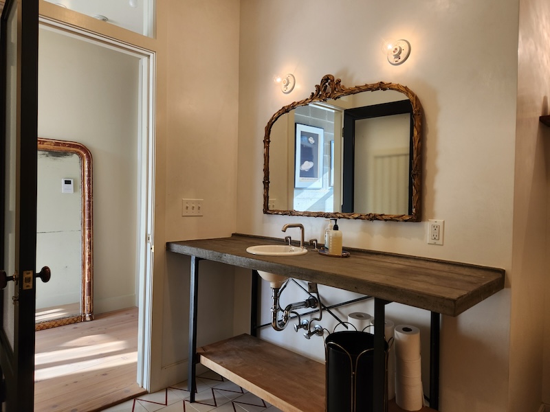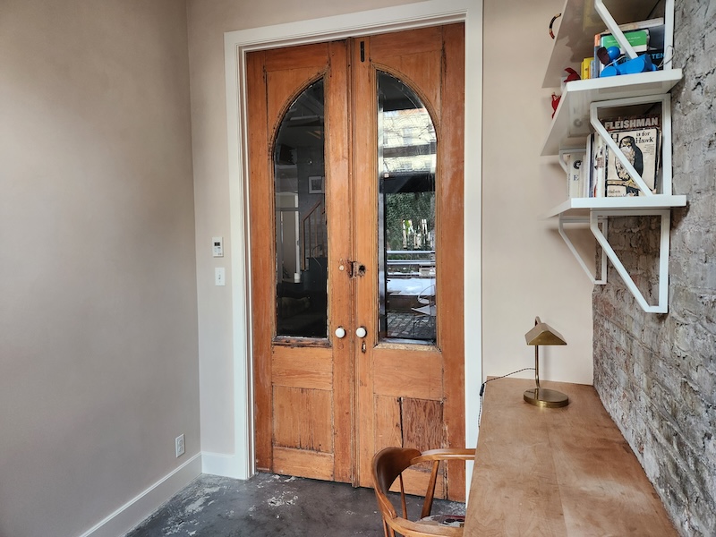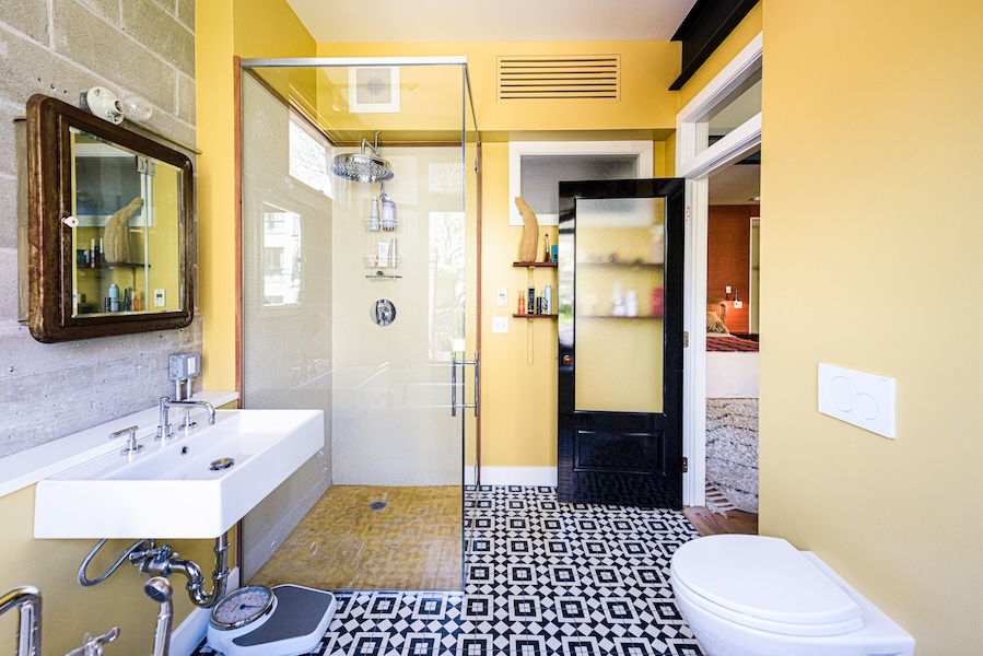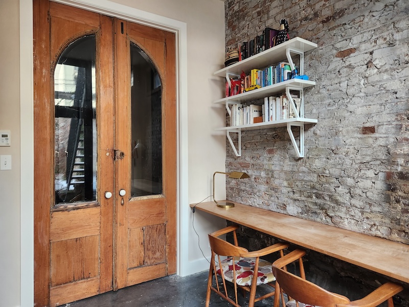 Originally a one-story auto-repair shop, now converted to apartment. This 2350 sq ft apartment has 11′ ceilings, exposed brick, poured concrete surfaces and steel windows throughout. Completed in 2015, the building mixes industry standard materials with architectural salvage finds and, with its variety of high-end interior finishes, this space has a uniquely textured, designer loft-like feel.
