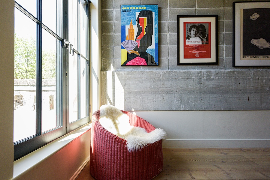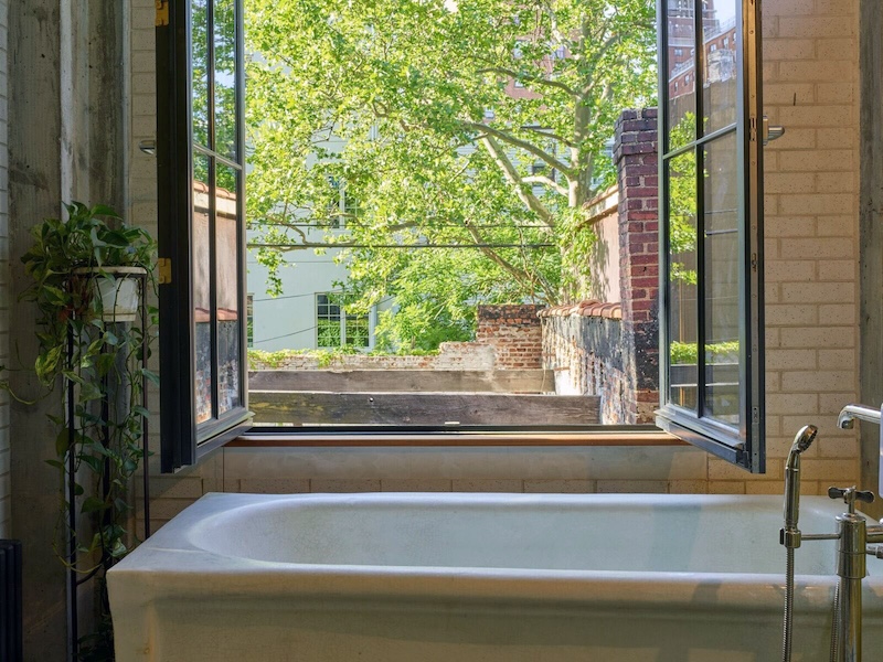 Downstairs you will find an open-plan living room which has a wood-burning fireplace, a large kitchen area with a central island that seats 4, and adjoining dining room – flooded with natural light from steel casement windows and skylight. Here, the steel doors open onto a private garden with 20′ high ivy-covered brick walls, planted flowerbeds, festoon lights, a picnic table + benches and a grill. The ground floor also has two office spaces and a powder room.