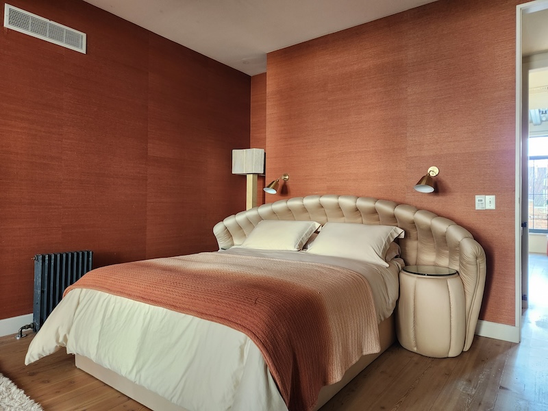 Upstairs – all beautifully lit by large windows – is a spacious master bedroom with grass cloth-covered walls, an en-suite bathroom, a walk-in closet, and a balcony leading down to the garden. The spacious interior hallway leads to a guest bathroom and guest bedroom.