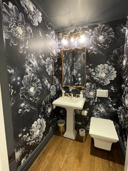 Primary bedroom with lavender walls, lavender velvet curtains, brass finishes and antique french side tables. Primary bathroom (18 feet long) with a mosaic floor, brass and wood finishings and a separate W.C. Laundry Room with washer, dryer, sink, counter space, cabinets and shelves. Guest bedroom with elegant floral wallpaper, and cream linen curtains. Children’s bedroom with a dark blue wallpaper, rug and shades with a white bunkbed. Children’s play & reading nook, decorated with blue chinoiserie wallpaper.