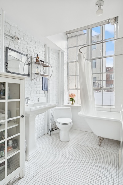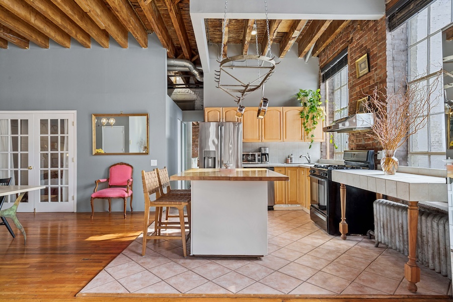The open kitchen connects directly to the main living area and includes a central island that works well for food shoots, lifestyle scenes, or prep space. Full appliances, including a dishwasher; the kitchen has its own distinct look thanks to the mix of brick, tile, and natural light. Washer and dryer in the unit.